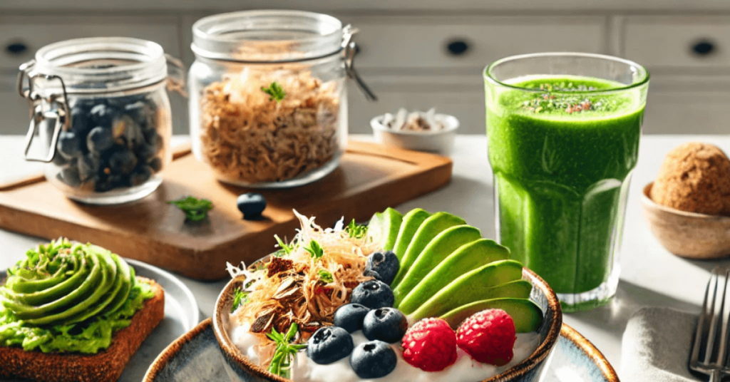b. Smoothie Bowls Blend spinach, kefir, banana, and a handful of berries. Top with granola, flaxseeds, and nuts for a nutrient-rich start.
